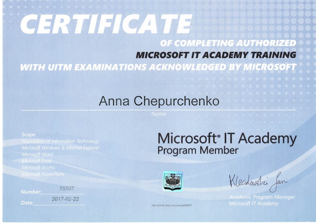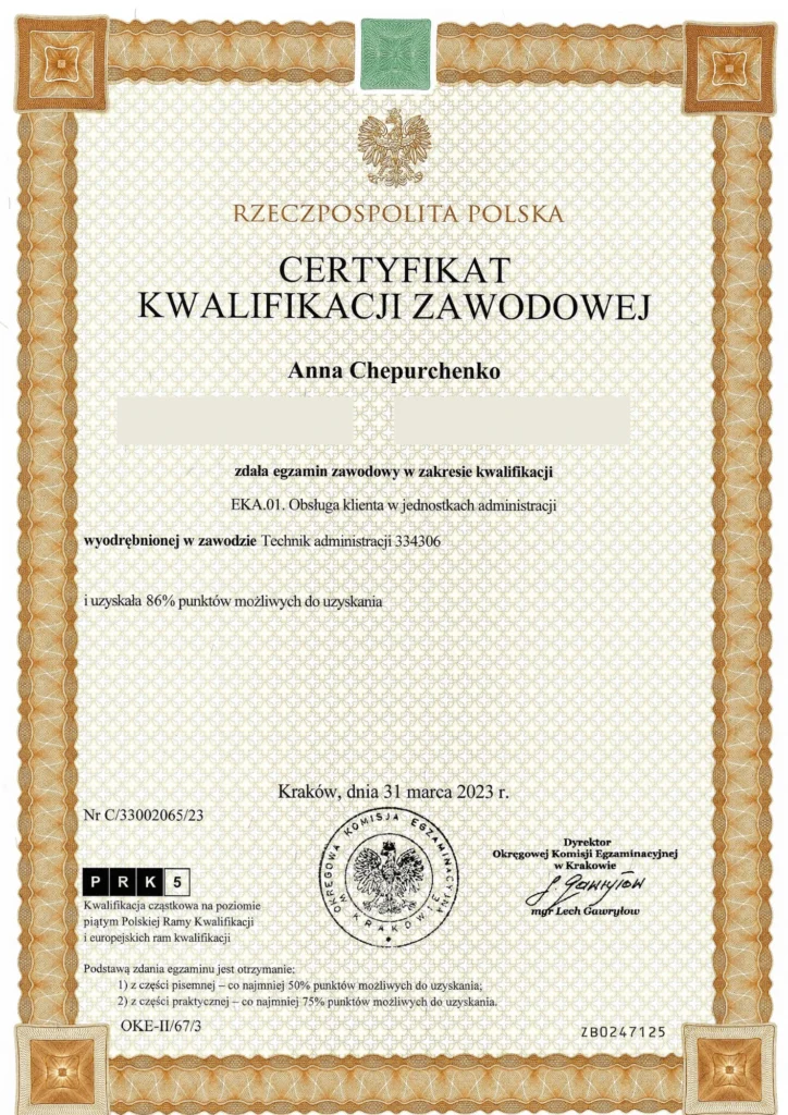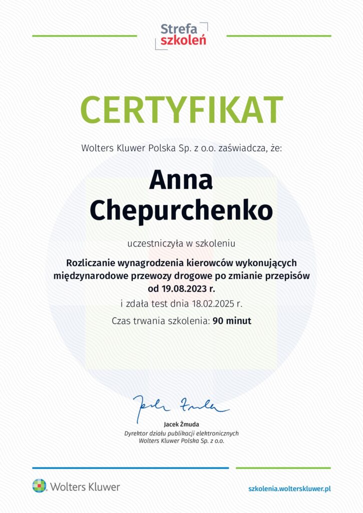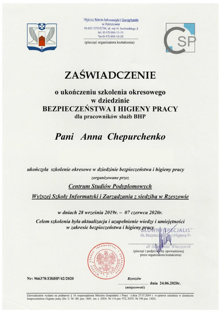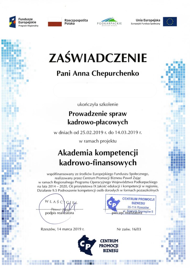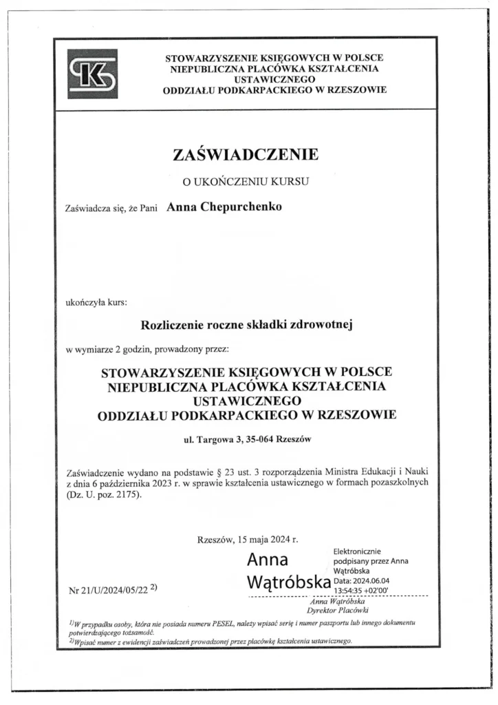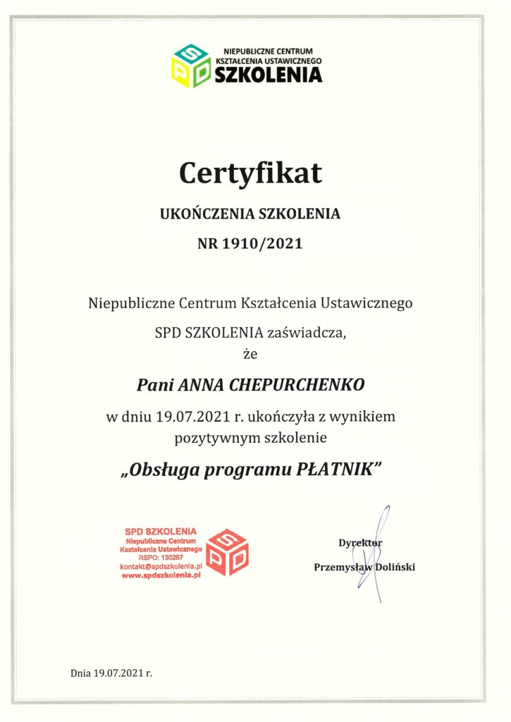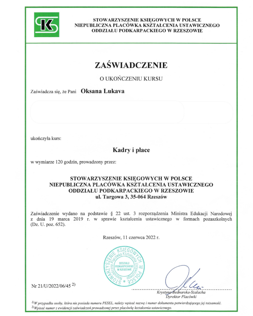 Posiada certyfikat Specjalisty ds. rachunkowości (II stopień SKwP), co potwierdza jej kompetencje w zakresie prowadzenia księgowości i rozliczeń finansowych.
