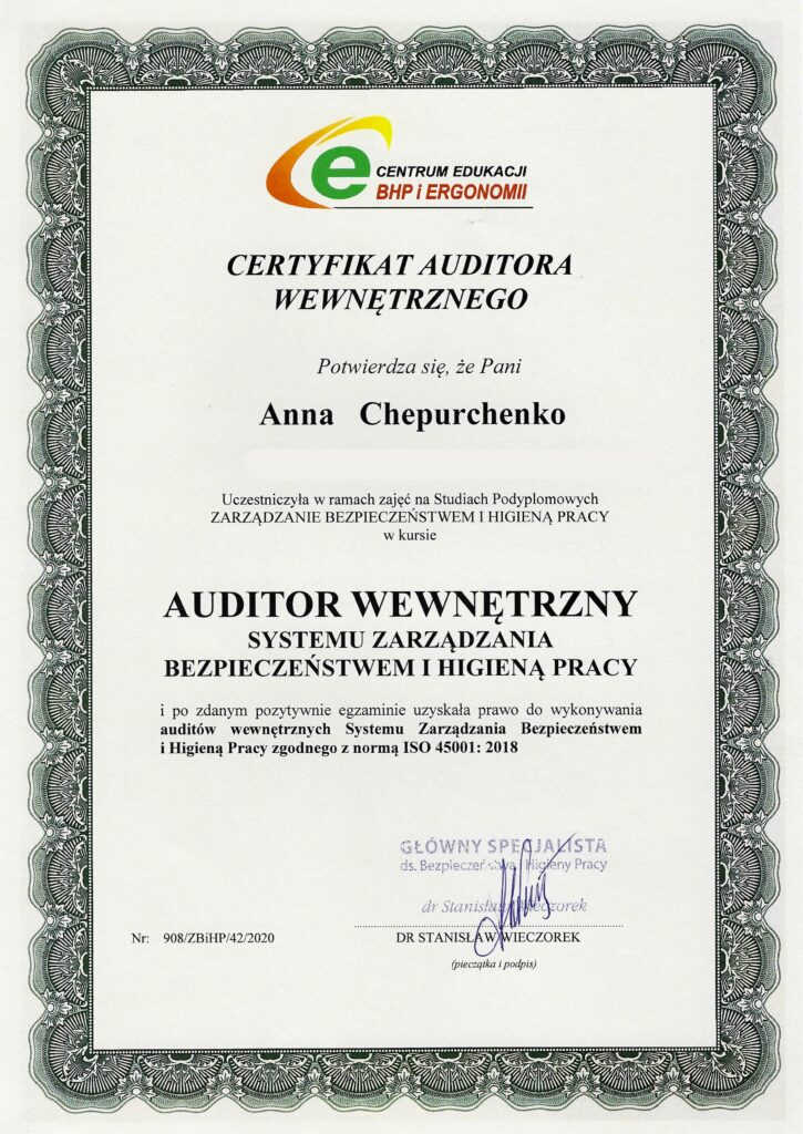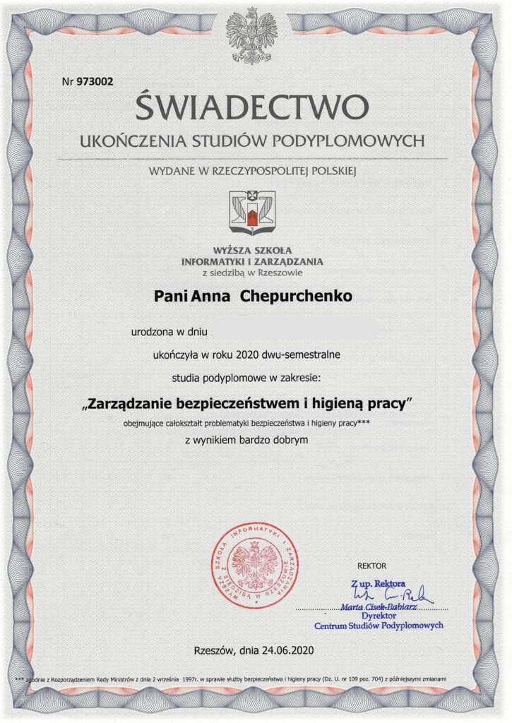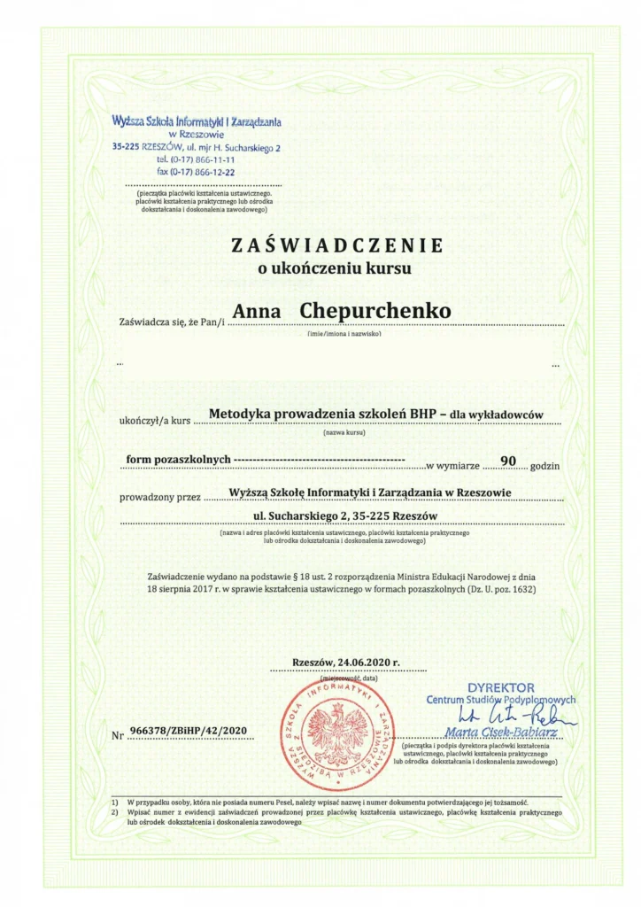 W 2019 roku ukończyłam studia na kierunku transport i spedycja. Pierwsze doświadczenie zawodowe zdobywałam jako specjalistka ds. legalizacji i zatrudniania cudzoziemców. Wkrótce poszerzyłam swoje kompetencje, kończąc studia podyplomowe z zakresu BHP oraz kursy kadrowo-płacowe, dzięki którym rozpoczęłam pracę jako kadrowa. Posiadam także tytuł technika administracji.
