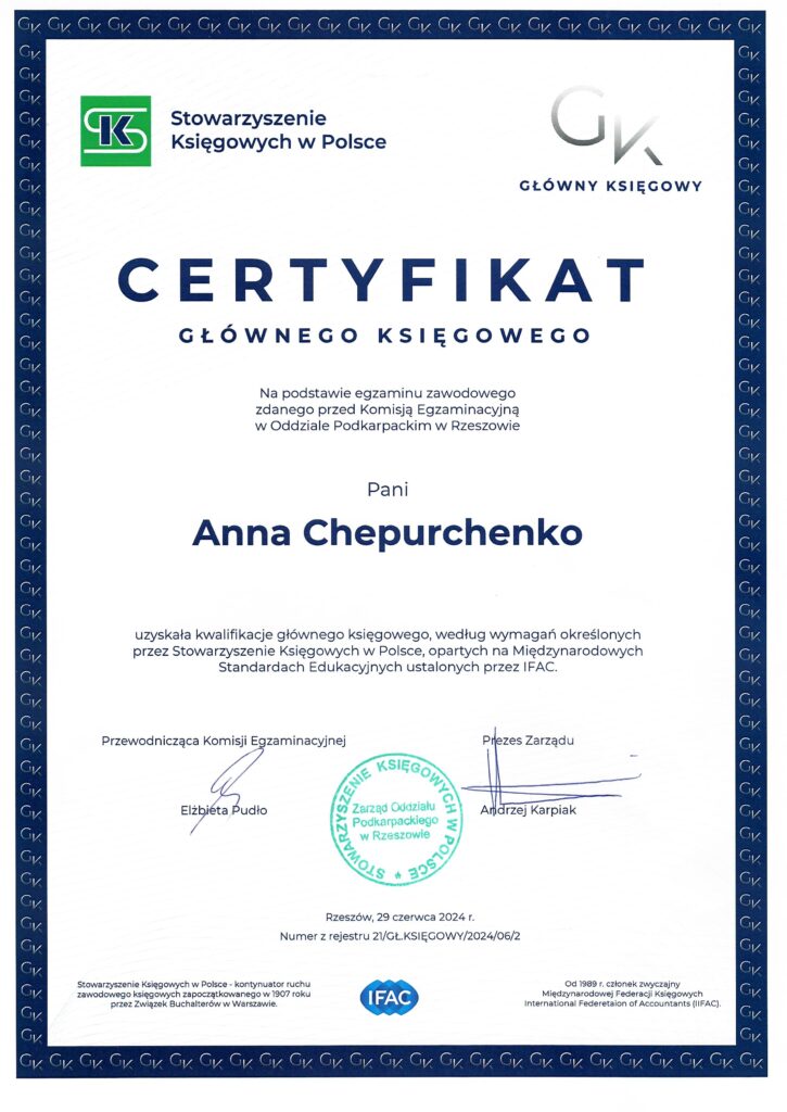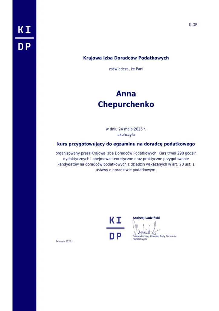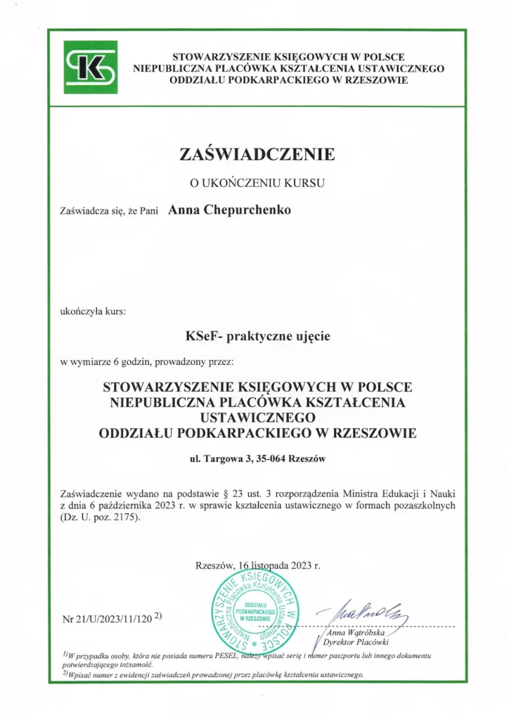 W 2021 roku rozpoczęła się moja przygoda z księgowością – ukończyłam pierwszy stopień w Stowarzyszeniu Księgowych w Polsce, a następnie systematycznie pogłębiałam wiedzę na kolejnych kursach i szkoleniach. W 2024 roku uzyskałam stopień głównej księgowej i aktualnie przygotowuję się do egzaminu na radcę podatkowego.